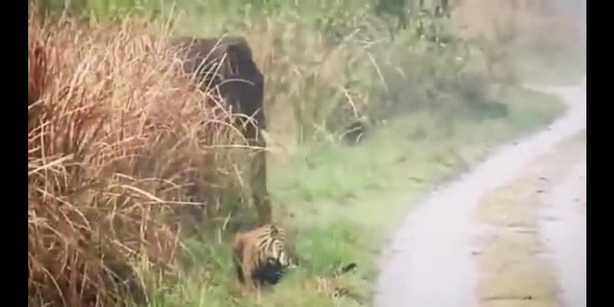 C'est ainsi qu'un tigre s'arrête et laisse la voie libre aux éléphants.