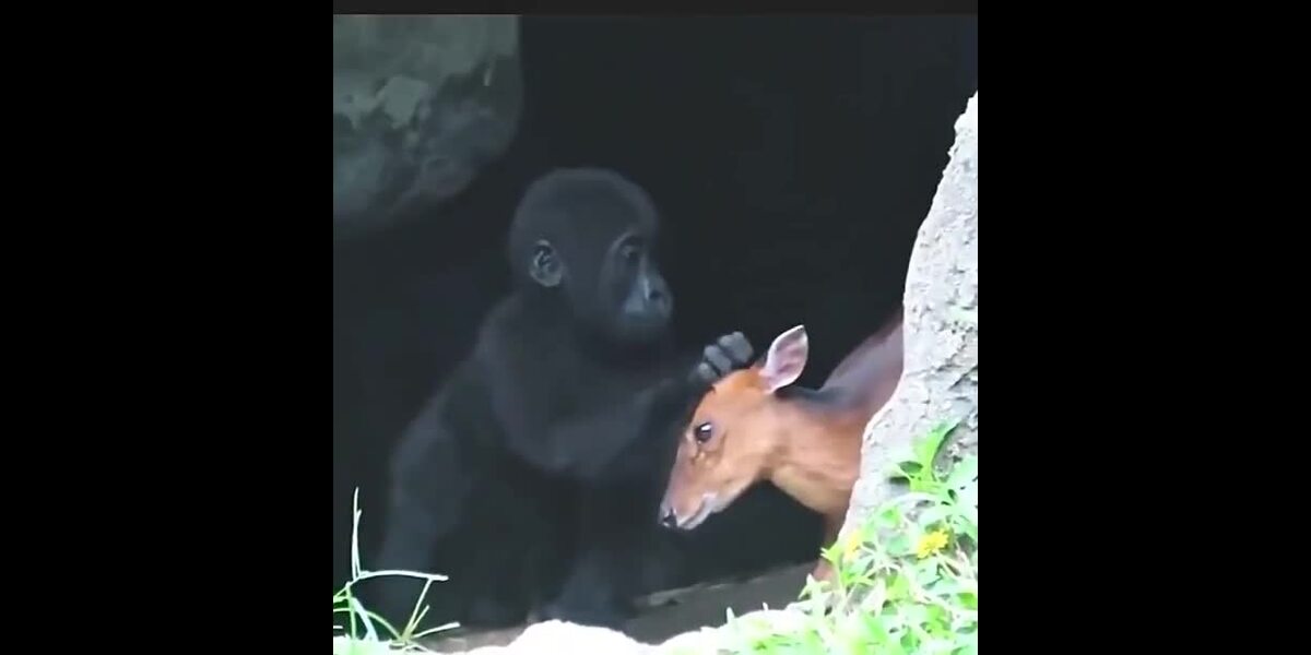 Un jeune gorille se lie d'amitié avec une biche.