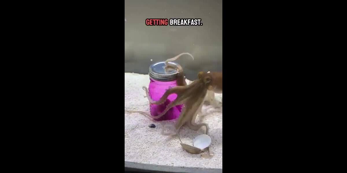 Une pieuvre dévisse un bocal pour accéder à la nourriture.