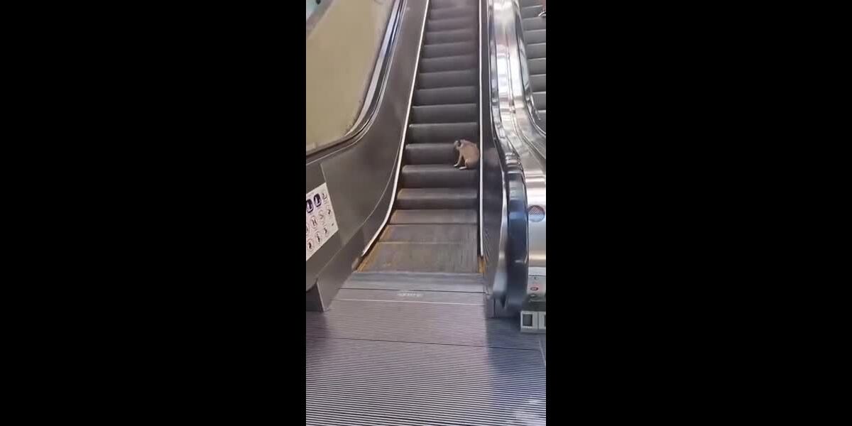 Le chien aime les escaliers roulants.