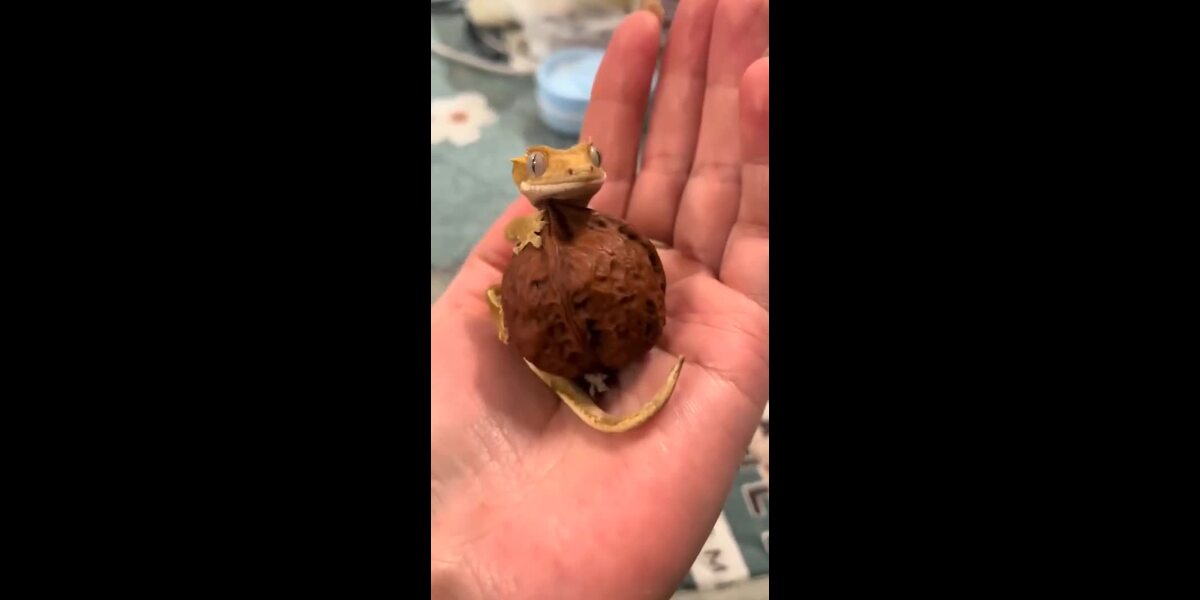 Voici un tout petit gecko qui joue avec une coquille de noix.