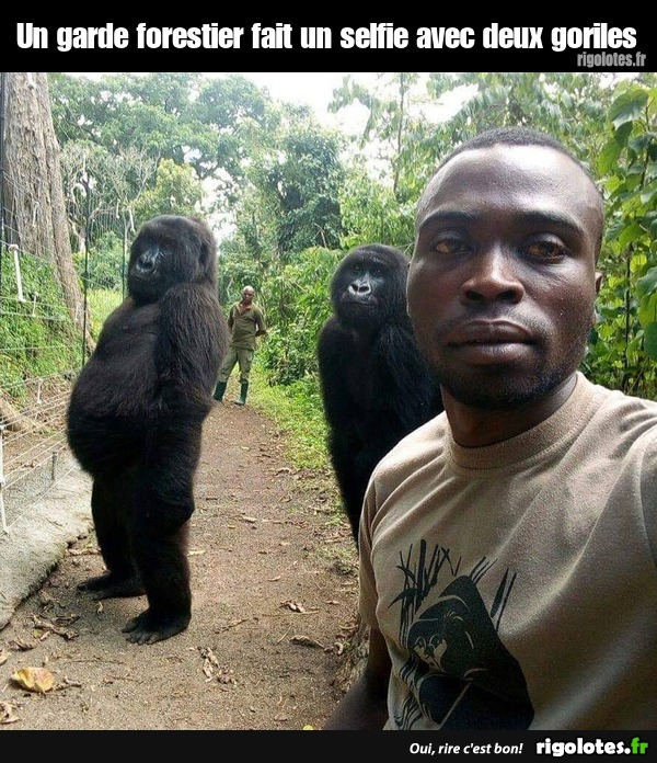 Un garde forestier fait un selfie avec deux goriles